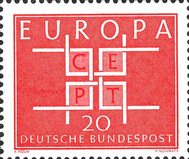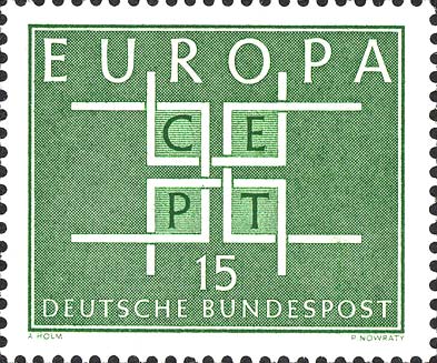 Notizie: L'emissione Europa, conosciuta fino al 1992 anche come Europa-CEPT, è un'emissione congiunta annuale di francobolli, con un medesimo soggetto o uno stesso tema, emessi dai paesi membri della Comunità europea (1956-1959), della Conferenza Europea di Poste e Telecomunicazioni (CEPT) (1960-1992) e infine di PostEurop (dal 1993). Il 15 settembre 1956 viene emessa la prima serie di francobolli da parte delle amministrazioni postali dei sei paesi aderenti alla CECA; i francobolli hanno lo stesso soggetto: una torre in costituzione costituita dalle lettere della parola latina Europa circondata da un'impalcatura, sullo sfondo sventolante la bandiera federalista. Nel 1959 si tiene la prima Conferenza Europea di Poste e Telecomunicazione e dall'anno successivo i 19 paesi aderenti iniziano ad emettere francobolli con lo stesso soggetto. Alcuni paesi però emettono anche francobolli con un soggetto diverso da quello comune, sia pure con la scritta “Europa”, per cui nel 1970 la CEPT autorizza l'emissione di francobolli con soggetti diversi purché vi compaia il logo CEPT. A partire dal 1974 il soggetto comune viene sostituito da un tema comune che viene liberamente interpretato da ciascuna amministrazione. Nel 1993 la CEPT viene sostituita da PostEurop. Solo nel 1984 per il venticinquennale della CEPT e nel 2000 per l'inizio del nuovo millennio si torna al disegno comune.
