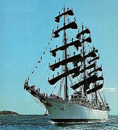 Notizie: Lo scafo della nave Libertad venne impostato il 30 maggio 1956 dal cantiere Astilleros y Fabricas Navales del Estado a Río Santiago (Buenos Aires, Argentina) per conto dell'Armata Argentina. Scafo in acciaio, lunghezza 103,75 metri, larghezza 14,31. Immersione 6,60 metri. Puntale 11,30 metri. Dislocamento massimo 3.765 tonnellate. Dislocamento standard 3.025. Propulsione principale 27 vele per 2652 m2: 15 quadre, 6 stralli, 4 fiocchi, 1 randa e 1 controranda. Velocità massima 18 nodi. Propulsione ausiliaria: due motori diesel da 1.200 HP cadauno. Velocità massima 12 nodi, di crociera 8. Dispone di 2 lance a motore, una scialuppa semirigida, una baleniera, 22 zattere autogonfiabili. Venne varata il 28 maggio 1963 per essere impiegata per conto della Scuola Navale dell'Accademia di Marina della Repubblica Argentina. Il 19 giugno 1963 fece il viaggio inaugurale di istruzione con l'equipaggio composto da un comandante, 22 Ufficiali, 49 Cadetti della Scuola Navale Militare, 39 Aspiranti della Scuola Meccanica dell'Armata e da 239 marinai. E' detentrice del record di velocità sulla tratta Cape Race (Canada) - Dublino - Liverpool, avendo percorso 2.058 miglia in otto giorni e dodici ore. Partecipa altresì ai maggiori raduni internazionali ed alle regate della Tall Ships Race. (Da: http://www.mail-archive.com).