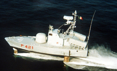 Notizie: La Classe Sparviero è una serie di aliscafi missilistici prodotta, come residuo del programma NATO per questo tipo d'imbarcazioni, in sette esemplari, incluso il prototipo, entrati in linea nella Marina Militare durante gli anni settanta e radiati nel corso degli anni novanta, molto simili ai Pegasus americani. Dotati di un sistema alare completamente immerso, realizzato in acciai speciali e ripiegabile, questi aliscafi non sono dotati di stabilità intrinseca in sostentamento alare. La stabilità è ottenuta con un sistema di sensori giroscopici ed accelerometrici, controllati da un computer e attuati attraverso superfici di controllo sul sistema alare, utilizzate anche per manovrare le unità in sostentamento. Propulsi a idrogetto mediante una pompa calettata su una turbina a gas Rolls-Royce da 5000hp, con aspirazione attraverso il sistema alare e spinta attraverso 2 ugelli posti a 2/3 dello scafo (velocità continuativa oltre 45kts), gli aliscafi erano dotati anche di un motore diesel con piede poppiero per la propulsione in galleggiamento (v max 6kts)e di 2 APU di tipo aeronautico per la generazione idraulica ed elettrica (440 V 400 Hz.) Lo scafo, in leghe leggere, è suddiviso in cinque compartimenti stagni. La sovrastruttura comprende COC e plancia (oltre al sistema di aspirazione TAG) ed è sovrastata dalla colonnina radar/optoelettronica della direzione del tiro, mentre un alberetto a traliccio porta il radar di scoperta, il sistema di guida dei missili OTOMAT, i sistemi ESM ed ECM e le antenne per le comunicazioni. L'equipaggio era composto da 2 Ufficiali inferiori e 8 Sottufficiali, l'abitabilità ridotta ai minimi termini. Sorprendentemente piccoli, essi disponevano di un cannone OTO Compatto da 76/62 da 90 colpi al minuto e 2 missili a lungo raggio Otomat, ma il raggio d'azione era di soli 500 km e i costi operativi comparabili con quelli di una fregata. Le unità erano classificate come pattugliatori dalla NATO, da questo la lettera P nel pennant number: Sparviero P420, Nibbio P421, Falcone P422, Astore P423, Grifone P424, Gheppio P425, Condor P426.