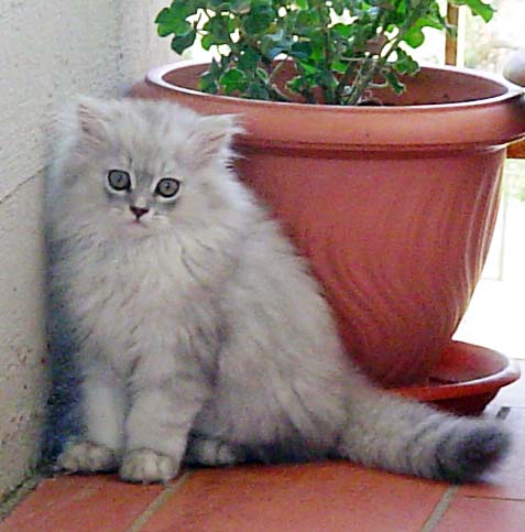 Descrizione: Il Chinchillà è una pregiata varietà tipped di gatto persiano a pelo lungo. Il Persiano Chinchillà ha origini britanniche e il primo esemplare nasce intorno agli anni '80 del XIX secolo. Il nome è correlato al coniglio Chinchillà per la somiglianza della colorazione del pelo (il roditore ha il mantello scuro con le punte chiare, il gatto ha il mantello chiaro con le punte più scure). La somiglianza venne notata inizialmente su una gatta Persiano Smoke. La padrona decise di farla accoppiare con un Persiano Tabby, da cui nacque una gattina che a sua volta fu accoppiata con un Persiano Smoke. Tra la cucciolata spiccò un gattino particolarmente bello e perfettamente proporzionato: Silver Lambkin fu ufficialmente riconosciuto primo esemplare di Persiano Chinchillà. Silver Lambkin può vantare la vittoria della maggior parte dei premi consegnati alla mostra del Crystal Palace nel 1888. Inizialmente la razza era più scura della varietà attuale e i tentativi effettuati per ottenere una colorazione più chiara sono in qualche occasione andati a discapito dei gatti stessi. In Europa, a causa dell'eccessivo intervento umano, questa razza ha infatti subito, soprattutto intorno alla metà del novecento, un notevole indebolimento. Fortunatamente sono stati rapidamente importati esemplari dall'America, salvando la razza che oggi gode di buona salute. Con il passare del tempo la razza ha acquisito un prestigio sempre maggiore. È un gatto di taglia medio-grande e di corporatura piuttosto robusta. Lo contraddistingue l'abbondante mantello bianco, caratterizzato da un tipping nero che ricopre 1/8 della lunghezza del pelo, donandogli riflessi argentei. Il tipping deve essere presente, secondo lo standard, sulla testa, sul dorso, sulle gambe e sulla coda, mentre mento, petto, ventre e i ciuffetti delle orecchie devono essere completamente bianchi. Il pelo è particolarmente fine e molto setoso al tatto. La coda è piuttosto corta, ma anch'essa riccamente ricoperta da un lungo e folto mantello. Le zampe sono corte ma muscolose con piedi rotondi che presentano ciuffetti di pelo più lunghi tra le dita. Il muso è molto corto e rotondo, il cranio è ampio, le orecchie sono piccole, arrotondate e ben distanziate. Gli occhi sono verdi o blu-verdi, bordati di nero, grandi e rotondi. Sono inoltre molto aperti e conferiscono al gatto un'espressione quasi "impaurita", che suscita nei suoi confronti un'ulteriore tenerezza. Al 2011 esistono due varietà del muso. Una è la cosiddetta flat-face che è, per così dire, più schiacciata con occhi, naso e bocca molto ravvicinati tra loro. Queste, sono le caratteristiche standard del muso di un qualsiasi Persiano. L’altra varietà viene chiamata doll-face e ha una forma leggermente più affusolata, con lineamenti più distesi e occhi, naso e bocca proporzionati. Queste caratteristiche le conferiscono un’aria un po’ più dolce rispetto al classico aspetto imbronciato del Persiano comune. In ogni caso per aderire allo standard la fronte, il naso e il mento devono essere perfettamente allineati verticalmente. Il naso, nonostante non sia rivolto verso l'alto come in quasi tutti gli altri Persiani, è molto corto. Questa brevità della canna nasale è causa di abbondante lacrimazione e a volte di difficoltà respiratorie, soprattutto nei cuccioli.[5] Per questo motivo i Persiani (in generale) sono molto più delicati delle altre razze. Il tartufo (la parte del naso umida e senza peli, non comprendente la canna nasale) è di color mattone e, come gli occhi e la bocca, è bordato di nero. In linea di massima i Persiani sono più diffidenti dei gatti a pelo corto. Nonostante questo, il Chinchillà è un gatto socievole e affettuoso, che ama la compagnia ed è felice di ricevere attenzioni. È il gatto domestico per eccellenza, poiché è molto tranquillo e sembra preferire passare la maggior parte del suo tempo in casa, piuttosto che in giardino. Permane però nel comportamento una componente di altezzosità e aristocrazia. Alle esposizioni feline è la razza che più rimane impassibile di fronte alla folla. Non è affatto aggressivo, né con l'uomo né con altri animali, a parte le piccole prede. I cuccioli sono molto più scuri degli adulti ed iniziano a schiarire soltanto intorno ai due mesi di età. Per aderire allo standard, e quindi poter partecipare a concorsi ed esposizioni, il mantello del gatto adulto non deve presentare alcuna striatura più scura. Gli occhi sono azzurri ed iniziano ad assumere la caratteristica colorazione verde verde-blu, soltanto intorno al quarto mese di vita. Il temperamento dei cuccioli è logicamente più vivace rispetto al gatto adulto. Il folto mantello deve essere spazzolato quotidianamente (nel periodo della muta anche più di una volta al giorno) per evitare sia la formazione di nodi, sia che il gatto ingerisca una quantità eccessiva di pelo durante la propria toelettatura. Questo può infatti accumularsi nello stomaco, andando a formare delle palle di pelo a discapito dell’appetito e spesso della salute del gatto. Per prevenire la formazione di questi grovigli di pelo, si può anche dare al gatto del malto tramite un prodotto specifico, che trova generalmente di suo gradimento. Anche gli occhi, a causa della loro abbondante lacrimazione, devono essere puliti ogni giorno con un panno umido. Il persiano Chinchillà, soprattutto il maschio sterilizzato, è particolarmente predisposto alla formazione di calcoli renali o vescicali: utilizzare soltanto cibo confezionato secco significa non idratarlo sufficientemente ed esporlo maggiormente a questo rischio. Se si sceglie un cibo secco è bene quindi alternarlo in ogni caso a quello umido. Un Chinchillà adulto, di circa 2,5 kg, ha bisogno all’incirca di 100g di cibo umido al giorno o di 50g di alimenti secchi. Il maschio che superi i 4 kg può salire a 150g o 165g di cibo umido od a 60g di alimenti secchi (sono quantità indicative: tutto è relativo al peso e a