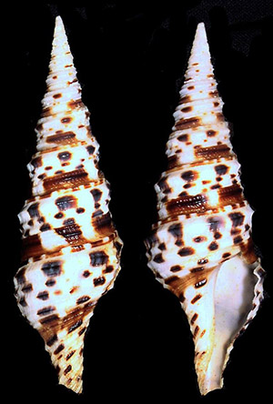 La dimensione di un guscio di un adulto varia tra 63 mm e 100 mm. Il guscio mostra spirali piuttosto angolari, causati dalla maggiore prominenza di una delle costole rotanti. La sua scultura mostra grandi nervature rotanti, con linee in rilievo intermedie. Il colore del guscio č biancastro, con grandi macchie marrone scuro o quasi nere sulle costole. I suoi embrioni si sviluppano in larve marine planctoniche a nuotata libera (trocoforo) e successivamente in velluti giovanili . Gli adulti si nutrono di vermi marini cacciati per mezzo del loro veleno, in modo simile ai conidi.