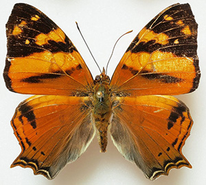 Ha un'apertura alare di circa 40-50 millimetri. Le ali anteriori sono nere con macchie arancione-marroni e una fascia marrone-arancione composta da poche macchie. Le posteriori sono di colore marrone arancione, con una fila di macchie nere nell'area marginale e una striscia nera stretta nell'area submarginale vicino all'apice. La parte inferiore delle ali mostra un motivo ornato e una colorazione marrone chiaro che ricorda le linee di contorno di una mappa topografica. Gli adulti hanno due code a coda di cavallo di lunghezza variabile. Le larve si nutrono di Phenax, Boehmeria, Celtis, Sponia e Trema micrantha.