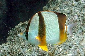 –Section: Fish Library: Group: Butterflyfishes: Species: Chaetodon hoefleri (Four-Banded Butterflyfish, Hoefler's Butterflyfish).