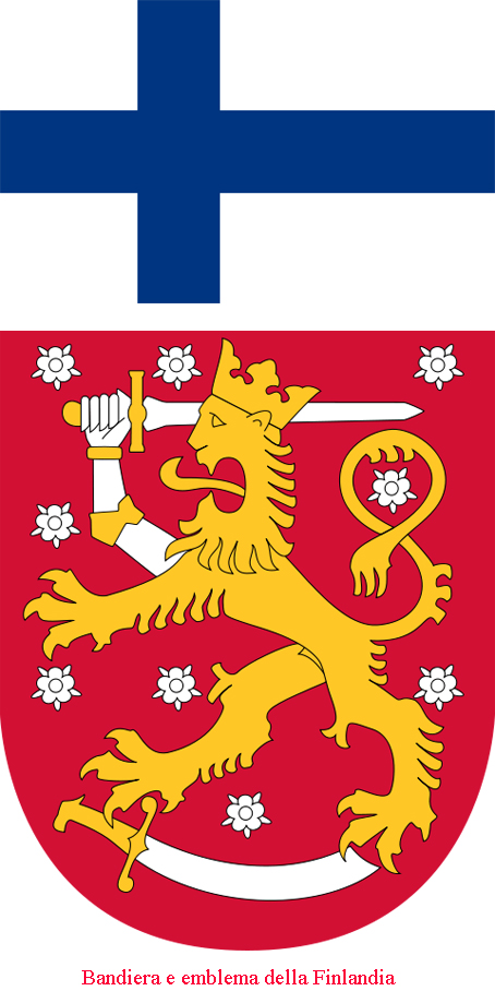Notizie: La bandiera della Finlandia (nome ufficiale siniristilippu, lett. "bandiera dalla croce blu") è stata adottata ufficialmente il 29 maggio 1918, ed è modellata sulla bandiera della Danimarca, la Dannebrog. I colori simbolo della Finlandia sono il blu e il bianco. Il blu rappresenta i laghi e il cielo, e il bianco rappresenta la neve. La bandiera nazionale finlandese ha forma rettangolare. Presenta una croce blu su sfondo bianco. L'elemento verticale della croce è spostato verso il lato dell'asta. La bandiera di stato ha uno stemma sovrapposto al centro della croce. In base alle leggi finlandesi, le proporzioni della bandiera nazionale sono le seguenti: altezza 11 - larghezza 18 - spessore della croce blu 3 - altezza dei campi in bianco 4 - larghezza dei campi in bianco dal lato dell'asta 5 - larghezza dei campi in bianco dal lato esterno 10. Le proporzioni verticali sono dunque 4:3:4 e quelle orizzontali 5:3:10. Secondo un'interpretazione poetica l'azzurro fa riferimento al cielo e al mare della Finlandia, mentre il bianco rappresenta la neve dei lunghi inverni scandinavi. Lo stemma della Finlandia raffigura un leone coronato color oro, su sfondo rosso, che calpesta una spada e ne tiene un'altra nella mano destra. Sullo sfondo rosso, distribuite in modo irregolare, sono presenti nove rose color argento. Gustavo I di Svezia, nel 1556, concesse al figlio, Giovanni III di Svezia, il titolo di duca della Finlandia. I territori della Finlandia proposero come stemma del ducato l'attuale stemma che venne approvato probabilmente nel 1557. Con l'indipendenza della Finlandia dopo la caduta dell'Impero Russo, nel 1917, lo scudo divenne lo stemma nazionale.