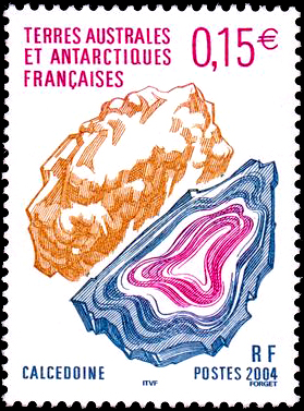 Notizie: II calcedonio è il nome generico che viene dato al quarzo quando si presenta in masse compatte microcristalline. Il nome deriva dal greco chalkedónios da Chalkédon, antica città della Bitinia. Tutte le varietà sono considerate pietre dure e utilizzate a scopo ornamentale. Struttura e caratteri distintivi: il calcedonio si presenta generalmente in forma di croste o masse concrezionarie, di colore uniforme o zonate con striature colorate di varie tonalità. Sono frequenti gli aggregati tondeggianti (mammellonari o botroidali) e nodulari. La struttura è costituita da fibre criptocristalline isorientate e in misura minore da aggregati microgranulari. La colorazione, molto variabile, dipende dalle impurezze presenti nel reticolo cristallino. A seconda della colorazione e dell'aspetto, il calcedonio prende varie denominazioni: il calcedonio comune, il calcedonio azzurro ed il calcedonio giallo: il primo ha un colore grigio azzurrognolo, biancastro o beige uniforme, ma non mancano i campioni di colore bianco-cera, azzurrognolo diafano o rosa-lilla. Il secondo ha una colorazione azzurro cenerino, azzurro lilla o azzurro violetto vivace, quest'ultima è la varietà più pregiata, ma anche i campioni provenienti dall'africa non sono dameno. Il terzo non presenta mai una colorazione uniforme nei campioni naturali. L’agata: è la varietà zonata con strie di colorazione molto variabile (bianco, marrone, blu, nero, verde, rosa etc...). È il tipico prodotto di precipitazione da soluzione idrotermale in rocce magmatiche e si associa frequentemente a quarzo cristallino (quarzo ialino e ametista). Può presentare inclusioni significative di acqua (enidro). La corniola: una varietà di calcedonio con inclusioni di minerali ferrosi da alterazione come limonite o ematite, caratterizzata da un colore rosso-giallo arancio. Il crisoprasio: un calcedonio traslucido e nickelifero con una colore uniforme tipicamente verde chiaro/giallo-verde. Il diaspro: sono così chiamati i calcedoni opachi e di colorazione uniforme. I colori più comuni sono le tonalità di rosso, viola e verde cupo. L’eliotropio: verde con macchie rosso-arancio dovute a inclusione di idrossidi di ferro. L’onice: opaco o semi-opaco, di colore uniforme che copre le tonalità rosso-bruno e l'intera gamma di grigi fino al nero. Se rinvenibile in forma massiva e stratificata prende il nome di selce: un materiale molto utilizzato dall'uomo nella preistoria per la preparazione di oggetti affilati e monili. Quando è stratificato e gli strati hanno colori contrastanti, si presta alla realizzazione di cammei. La sarda: è una sottovarietà di corniola più scura ma meno luminisa per via della sua colorazione bruna. La corniola-agata: è una sorta di incrocio tra i due minerali, presenta la colorazione della corniola, ma guardandola attentamente mostra la struttura della corniola. La sardonice: come la precedente è una sorta di incrocio, ma stavolta tra la sarda e l'onice.