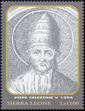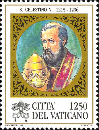 Notizie: (Molise, fra il 1209 ed il 1215 - Fumone, 19 maggio 1296)Celestino V, nato Pietro Angelerio (o secondo alcuni Angeleri) e detto Pietro del Morrone, fu il 192esimo Papa della Chiesa cattolica dal 29 agosto al 13 dicembre 1294. Eletto il 5 luglio 1294, fu incoronato ad Aquila (oggi L'Aquila) il 29 agosto nella Basilica di Santa Maria di Collemaggio, dove è sepolto. Celestino V fu il primo Papa che volle esercitare il proprio ministero al di fuori dei confini dello Stato Pontificio, e uno dei pochi, come San Clemente I e Gregorio XII, ad abdicare. È venerato come Santo dalla Chiesa cattolica che ne celebra la festa liturgica il 19 maggio. È patrono di Isernia e compatrono dell'Aquila, di Urbino e del Molise. Di origini contadine, penultimo di dodici figli, nacque tra il 1209 e il 1215 (la fonte più accreditata è tratta dalla "vita C" che racconta che aveva 87 anni al momento della morte avvenuta il 19 maggio 1296 e ciò vorrebbe dire, come dicono altre fonti, che sarebbe nato nel 1209). È certo che nacque in Molise. La sua nascita è tradizionalmente rivendicata da due comuni: Isernia[1] e Sant'Angelo Limosano (dei quali è patrono). In seguito altre due località ne hanno anch'esse rivendicato i natali: Sant'Angelo in Grotte (frazione di Santa Maria del Molise) e Castrum Sancti Angeli de Ravecanina, nel casertano. Da giovane, per un breve periodo, soggiornò presso il monastero benedettino di Santa Maria in Faifoli, chiesa abbaziale che, tra le dodici della diocesi di Benevento, era una delle più importanti. Mostrò una straordinaria predisposizione all'ascetismo e alla solitudine, ritirandosi nel 1239 in una caverna isolata sul Monte Morrone, sopra Sulmona, da cui il suo nome. Qualche anno dopo si trasferì a Roma, presumibilmente presso il Laterano, ove studiò fino a prendere i voti sacerdotali. Lasciata Roma, nel 1241 ritornò sul monte Morrone, in un'altra grotta, presso la piccola chiesa di Santa Maria di Segezzano. Cinque anni dopo abbandonò anche questa grotta per rifugiarsi in un luogo ancora più inaccessibile sui monti della Maiella, negli Abruzzi, dove visse nella maniera più semplice che gli fosse possibile. Si era allontanato temporaneamente dal suo eremitaggio del Morrone nel 1244 per costituire una Congregazione ecclesiastica riconosciuta da papa Gregorio X come ramo dei benedettini, denominata "dei frati di Pietro da Morrone", che ebbe la sua povera culla nell'Eremo di Sant'Onofrio al Morrone, il rifugio preferito di Pietro, e che soltanto in seguito avrebbe preso il nome di Celestini. Nell'inverno del 1273 si recò a piedi in Francia, a Lione, ove stavano per iniziare i lavori del Concilio di Lione II voluto da Gregorio X, per impedire che l'ordine monastico da lui stesso fondato fosse soppresso. La missione ebbe successo poiché grande era la fama di santità che accompagnava il monaco eremita. I successivi vent'anni videro la radicalizzazione della sua vocazione ascetica e il suo distaccarsi sempre più da tutti i contatti con il mondo esterno, fino a quando non fu convinto che stesse sul punto di lasciare la vita terrena per ritornare a Dio. Ma un fatto del tutto inaspettato stava per accadere. Numerose furono le riunioni dei padri cardinali nell'Urbe, ma sempre tenute in sedi diverse: a Santa Maria sopra Minerva, a Santa Maria Maggiore e sull'Aventino presso il monastero di Santa Sabina. Nonostante ciò, il Sacro Collegio non riusciva a far convergere i voti necessari su nessun candidato. Sopravvenne un'epidemia di peste che indusse allo scioglimento del Conclave. Nel corso dell'epidemia il cardinal francese Cholet fu colpito dal morbo e morì, per cui il Collegio Cardinalizio si ridusse ad 11 componenti. Passò più di un anno prima che il Conclave potesse nuovamente riunirsi, perché un profondo disaccordo si era creato circa la sede in cui convocarlo (Roma o Rieti). Finalmente si riuscì a trovare una soluzione sufficientemente condivisa, stabilendo la nuova sede nella città di Perugia; era il 18 ottobre 1293. I porporati però, nonostante le laboriose trattative, non riuscivano ad eleggere il nuovo Papa, soprattutto per la frattura che si era creata tra i sostenitori dei Colonna e gli altri cardinali. I mesi si susseguivano inutilmente e il permanere della sede vacante aumentava il malcontento popolare che si manifestava attraverso disordini e proteste, anche negli stessi ambienti ecclesiastici. Si giunse così alla fine del mese di marzo del 1294, quando i cardinali dovettero registrare un evento che, probabilmente, contribuì, forse in maniera determinante, ad avviare a conclusione i lavori del Conclave. Erano in corso, in quel momento, le trattative tra Carlo II d'Angiò, Re di Napoli, e Giacomo II, Re di Aragona, per sistemare le vicende legate all'occupazione aragonese della Sicilia, avvenuta all'indomani dei cosiddetti vespri siciliani, del 31 marzo 1282. Poiché si stava per giungere alla stipula di un trattato, Carlo d'Angiò aveva necessità dell'avallo pontificio, la qual cosa era impossibile, stante la situazione di stallo dei lavori del Conclave. Spinto da questa esigenza, il re di Napoli si recò, insieme al figlio Carlo Martello, a Perugia dove era riunito il Conclave, con lo scopo di sollecitare l'elezione del nuovo Pontefice. Il suo ingresso nella sala dove era riunito il Sacro Collegio provocò ovviamente la riprovazione di tutti i cardinali e il re fu cacciato fuori, soprattutto per l'intervento del cardinale Benedetto Caetani. Questa vicenda, con molta probabilità, indusse i cardinali a prendere coscienza del fatto che si rendeva necessario chiudere al più presto la sede vacante. Nel frattempo, Pietro del Morrone aveva predetto "gravi castighi" alla Chiesa se questa non avesse provveduto a scegliere subito il proprio pastore. La profezia fu inviata al Cardinale Decano Latino Malabranca, il quale la presentò all'attenzione degli altri cardinali, proponendo il monaco eremita come Pontefice; la sua figura ascetica, mistica e r