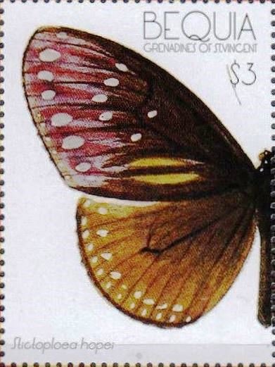 Emissione: Farfalle del Carribe Stato: Bequia Nota: Emesso in un foglietto di 2 v. diversi Sticloploea hopei non ho reperito nulla in rete |